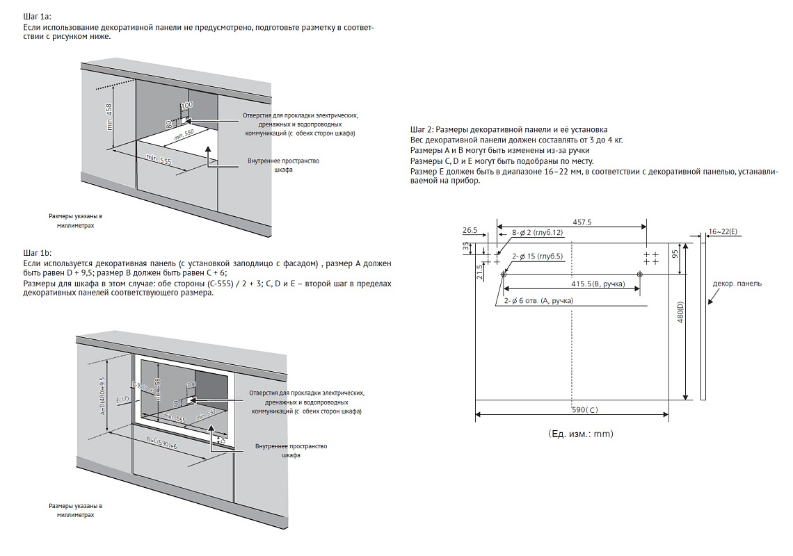 Ниша для установки выбирается согласно размерам прибора, указанным в инструкции. Выбор фасада и отверстий для его крепления должны быть основаны на шаблоне, входящим в комплект поставки. Для веса фасадов установлены примерные значения веса: (45 см) – мин 3,5 кг, макс 5 кг; (60 см) – мин 5 кг, макс 7 кг. Настройка высоты производится с передней стороны прибора путем регулировки уровня двух передних и одной задней ножки. Место размещения прибора рекомендуется выбирать в непосредственной близости от источников залива и слива воды. Залив воды происходит через защищенный шланг с автоматическим клапаном, подводку рекомендуется выполнять из таких же прочных и надёжных материалов. Слив воды необходимо выполнить с загибом шланга, чтобы исключить вероятность возврата воды в камеру. Все встраиваемые приборы имеют полную защиту от протекания воды.Внимание: рекомендуем ознакомиться с инструкцией по эксплуатации к прибору и, в случае необходимости, проконсультироваться со специалистом.